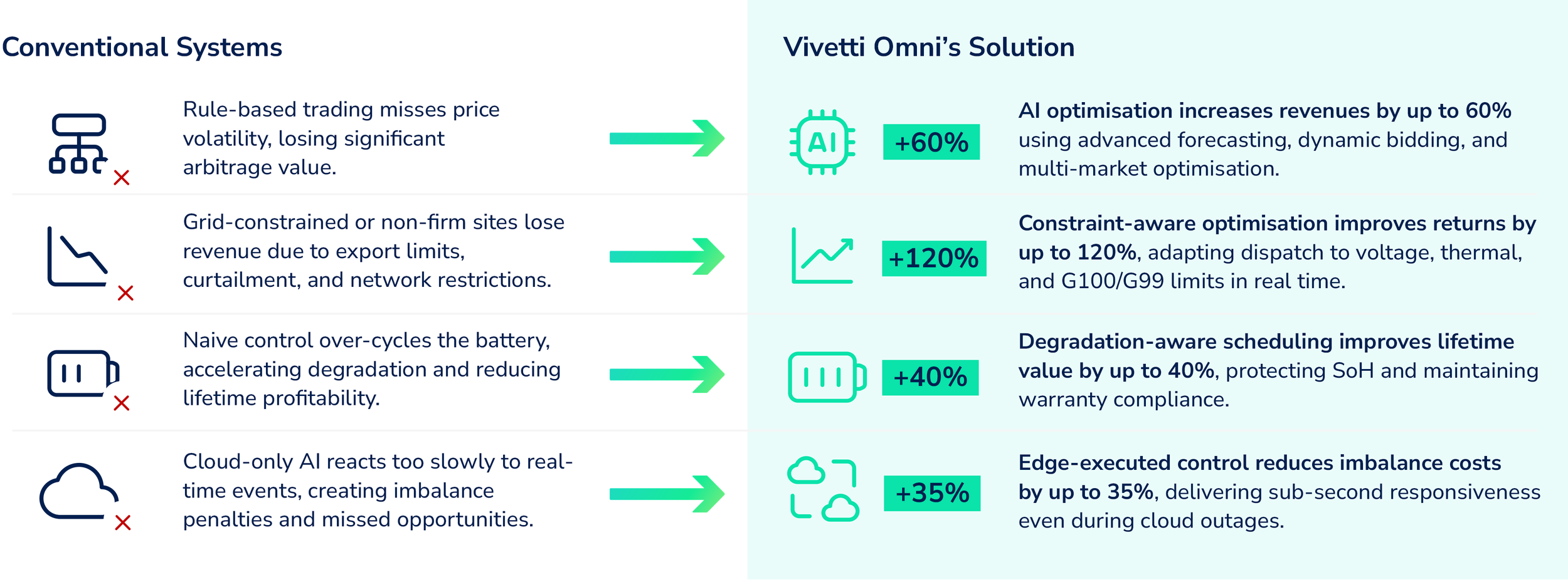 Vivetti’s AI-powered software platform, Omni™, connects, controls, and optimises distributed energy resources through automation, advanced analytics, and deep-learning algorithms, leading to enhanced technical performance and increased commercial returns for asset operators.